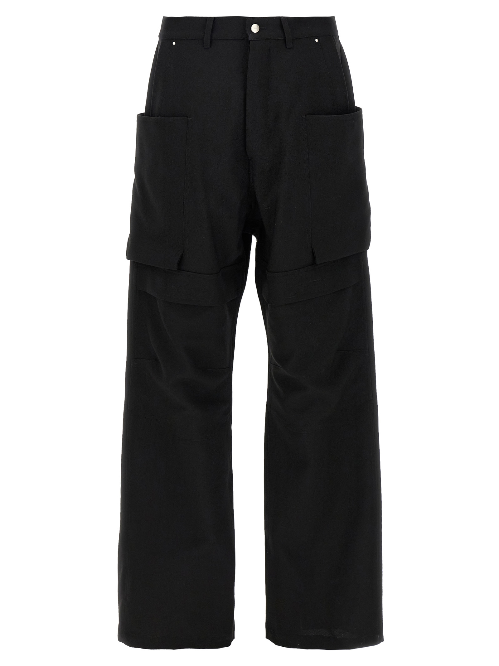 Stefan Cargo’ virgin wool trousers, side cargo pockets, low crotch model, front button closure, wide and straight leg, pockets.