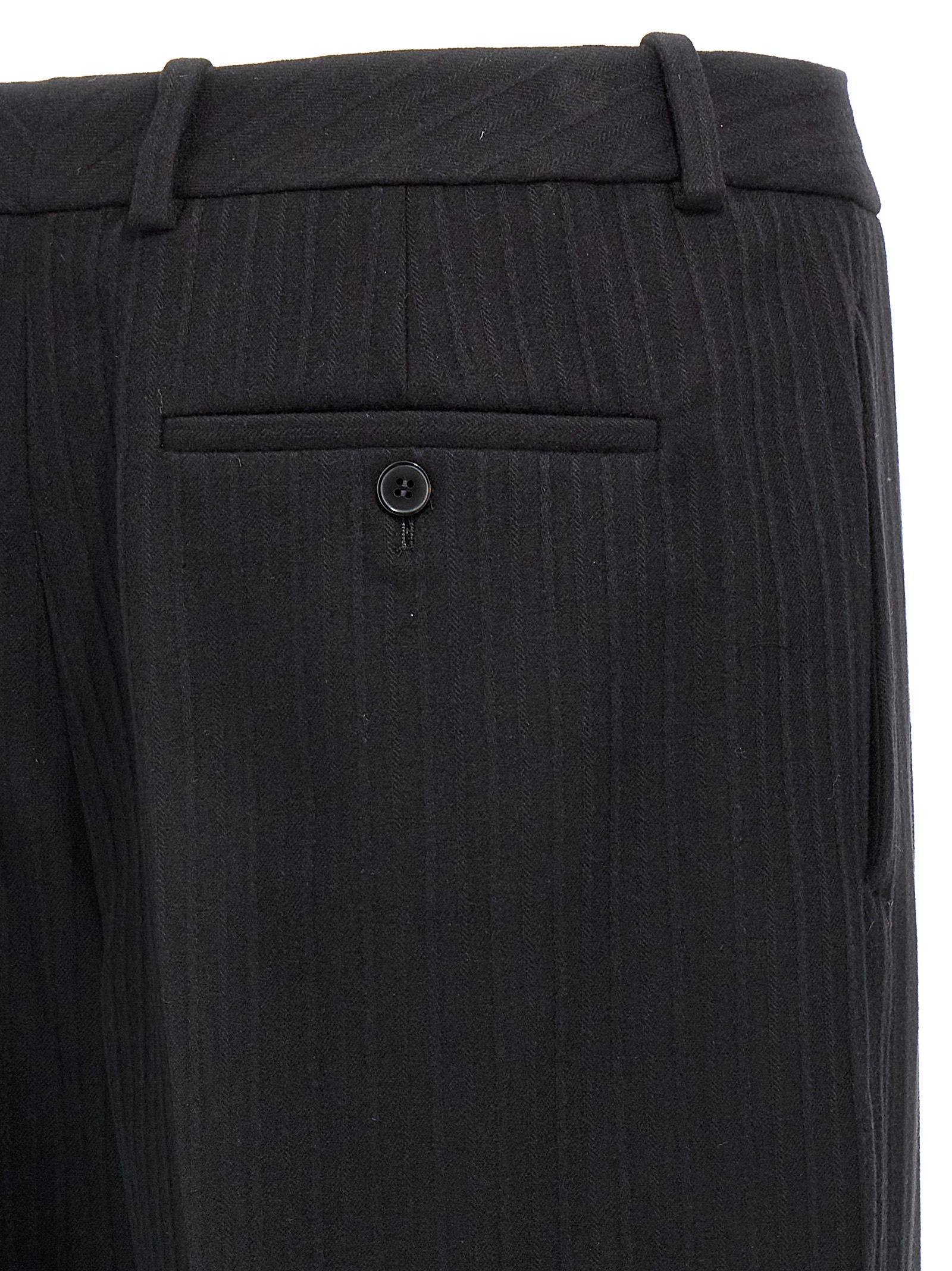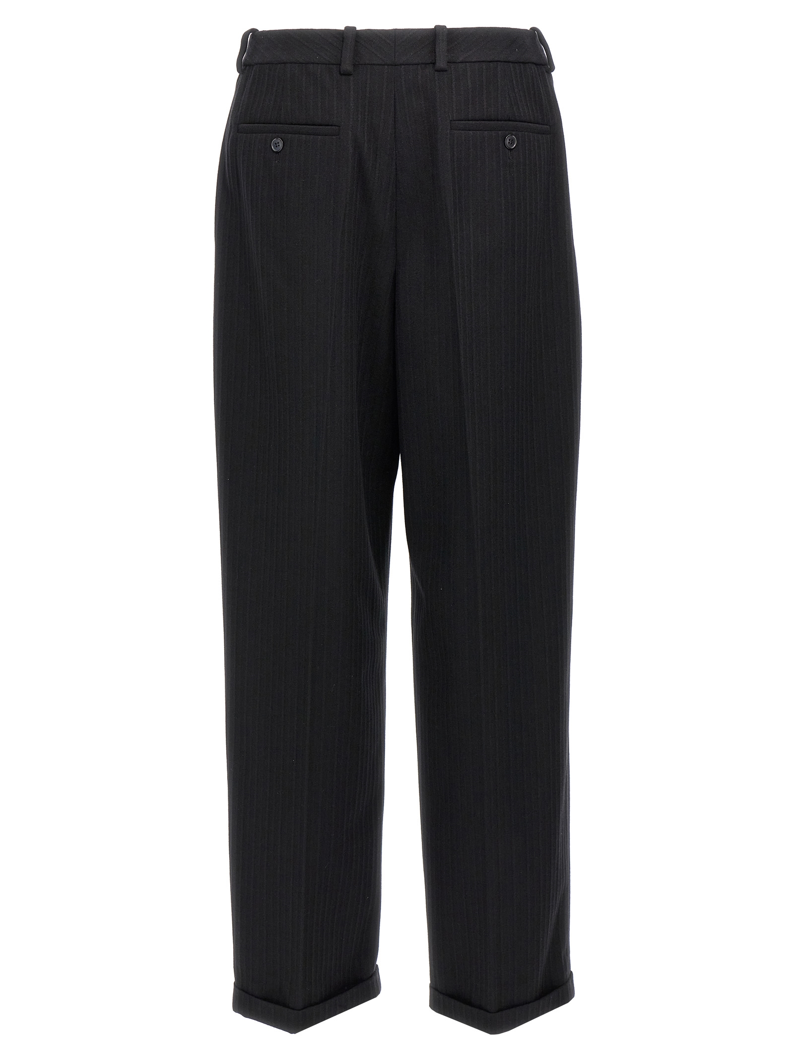 ’90’s’ wool and cashmere trousers with tone-on-tone embossed relief, hook and button zip closure, high-waisted style, straight leg with stretched pleat, pockets, turned-up hem.