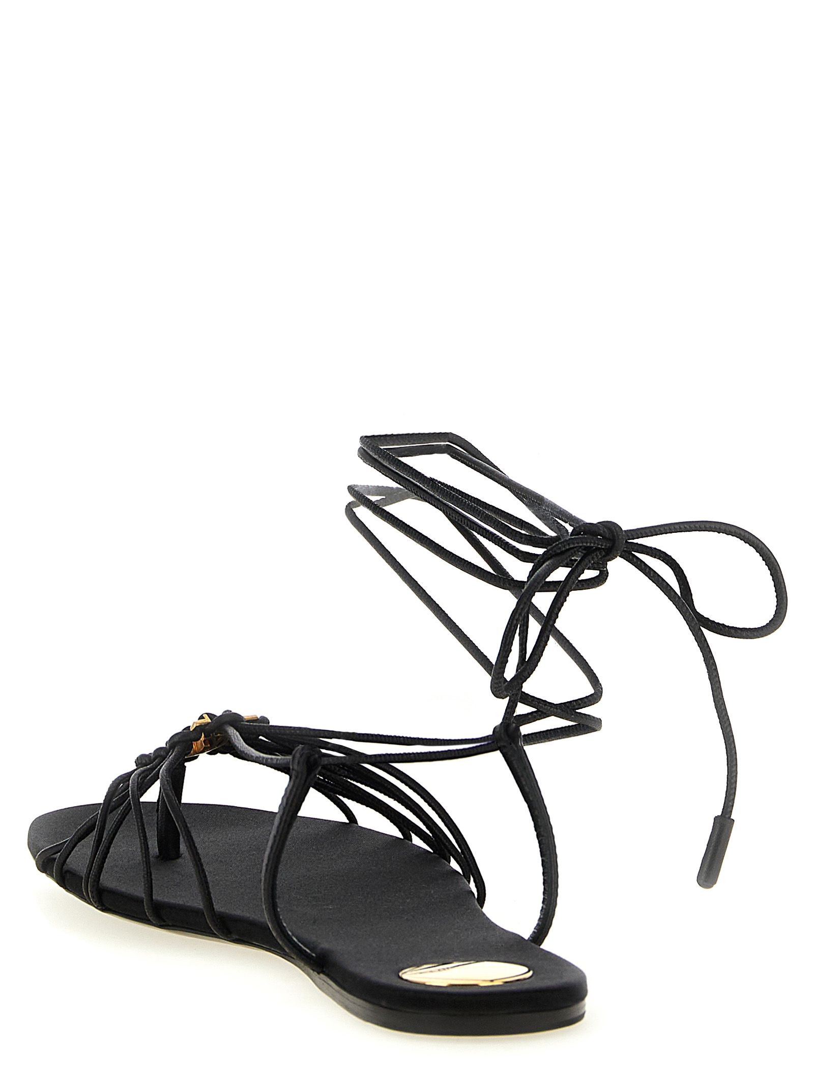 ‘babylone’ leather sandals with almond toe, Crossed straps with metal ‘cassandre’ logo detail on the front, To be tied at the ankle, Satin insole, Leather sole.