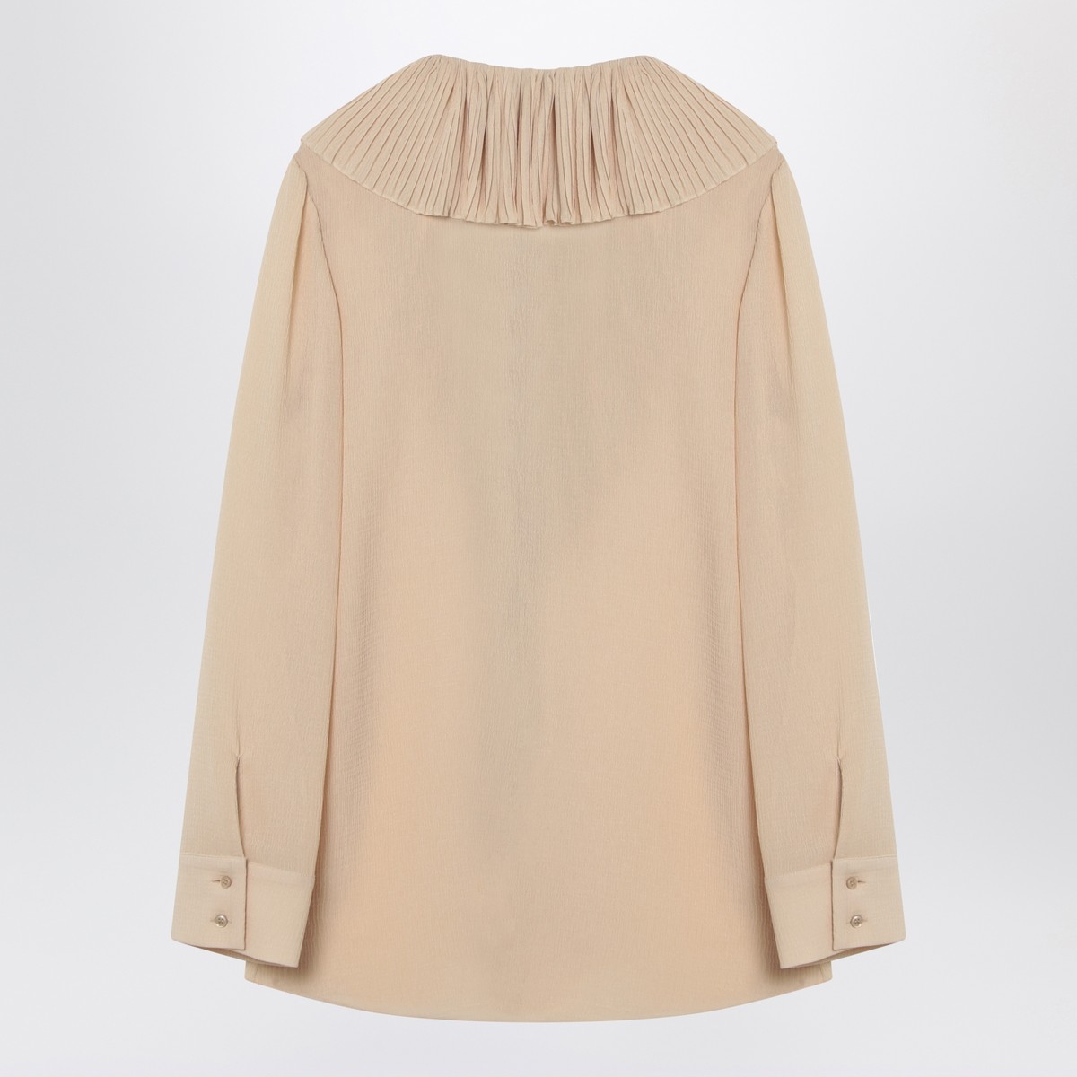 Beige silk crêpe blouse by Saint Laurent, featuring a wide V-neck with ruffles, long sleeves with buttoned cuffs, and a semi-transparent design.