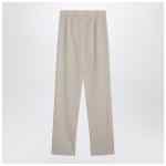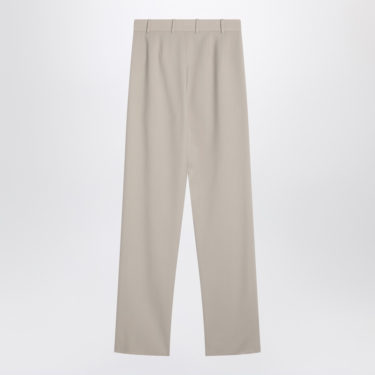 Beige wool trousers by Saint Laurent, featuring a front zip closure with a hook, front pleats, belt loops, and two side welt pockets.