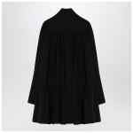 Wide Saint Laurent dress in black silk, characterized by long puff sleeves, ruffled skirt, button closure at the front, two side pockets, and lavallière collar.
