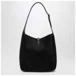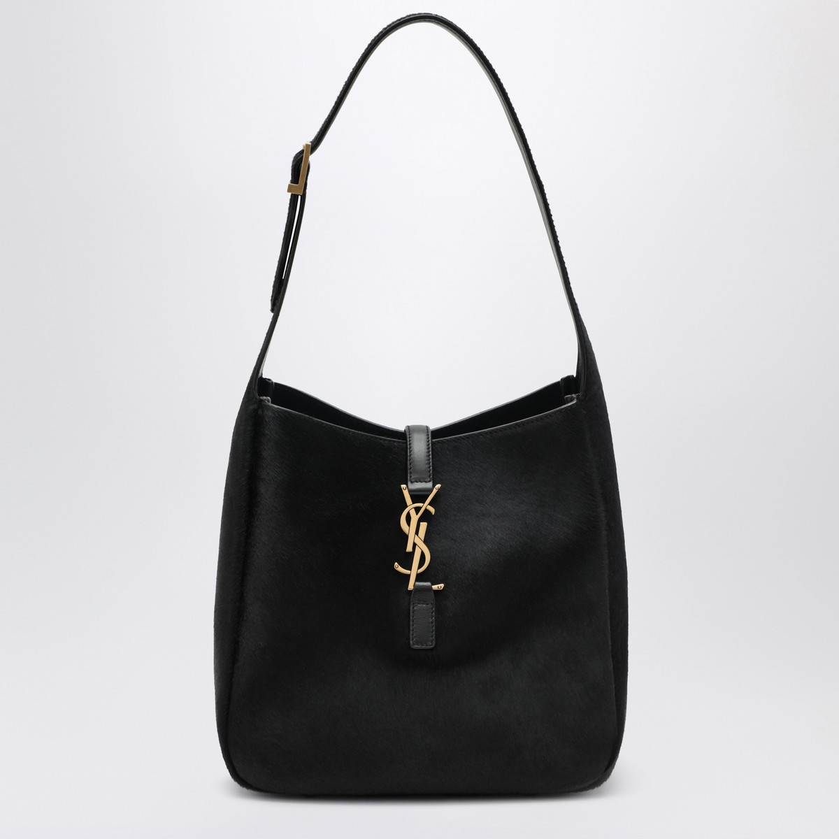Black pony-effect leather bag by Saint Laurent, featuring leather tab closure with Cassandre logo, adjustable top handle with buckle, and smooth leather internal zip pouch with logo lettering.