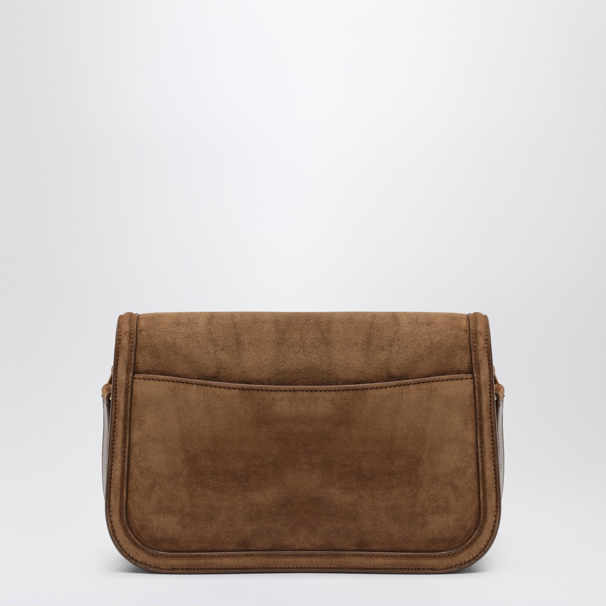 Saint Laurent caramel cognac suede shoulder bag, featuring an adjustable shoulder strap, front flap with gold Cassandre closure, a back slip pocket, and a flat internal pocket.