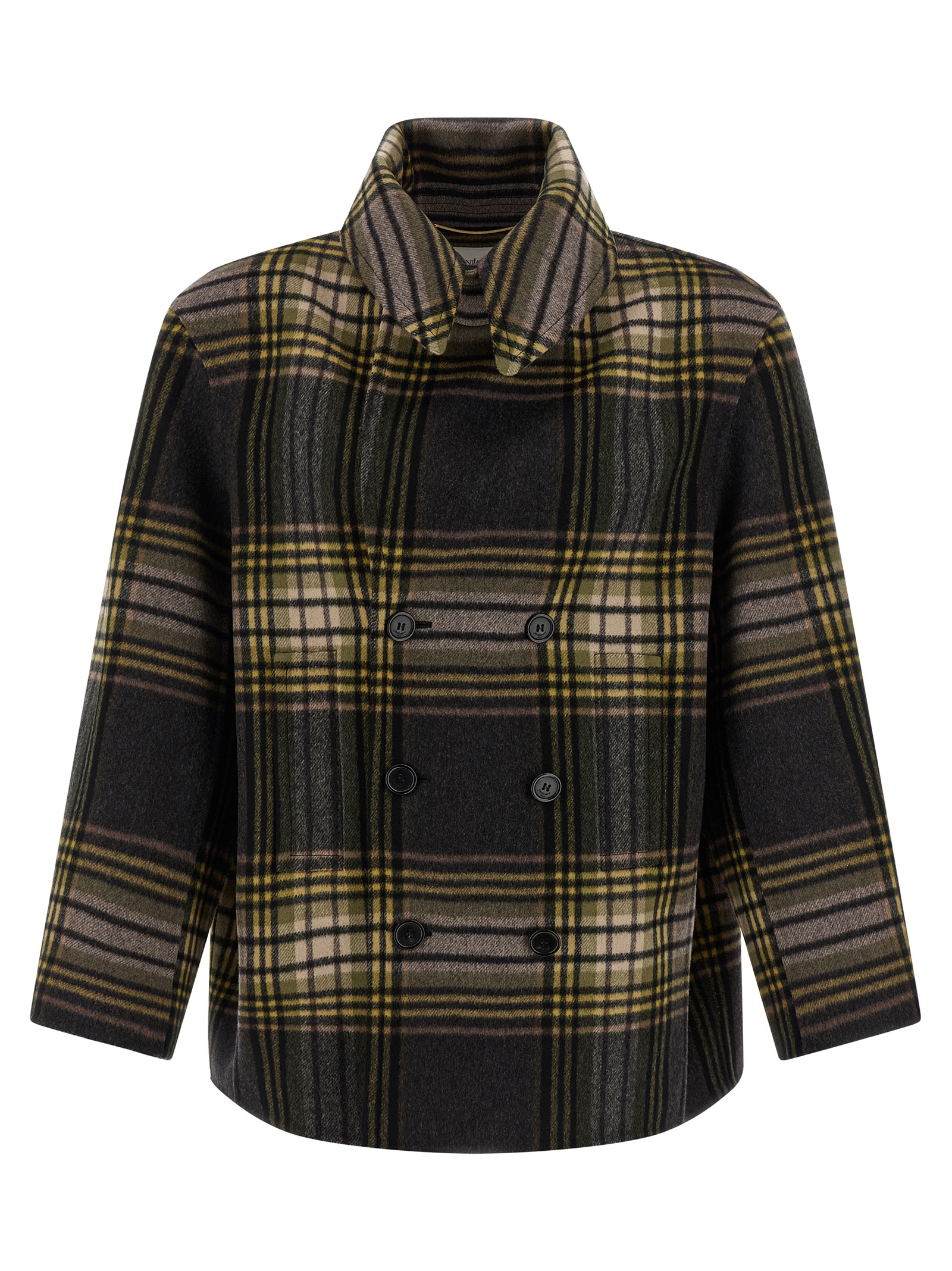 Double-breasted double-breasted caban wool coat with front button closure, Ulster collar, pockets, long sleeves with dropped shoulders, and unlined.