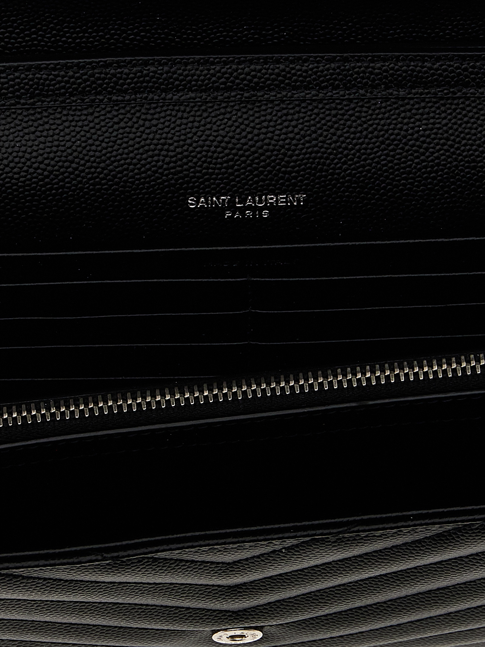 Cassandre’ quilted grain de poudre leather clutch bag, Magnetic flap closure with front metal logo appliqué, And removable chain shoulder strap.