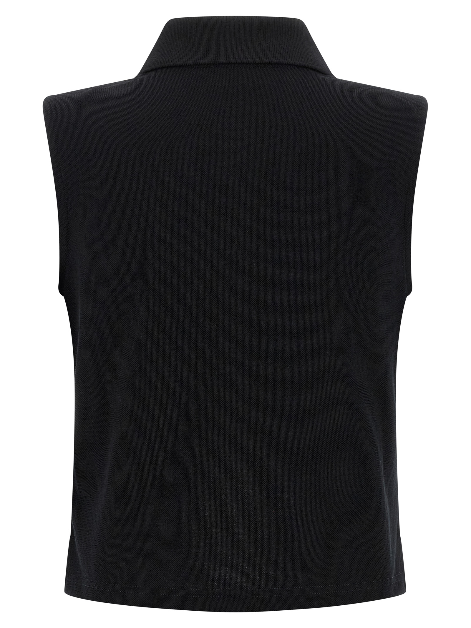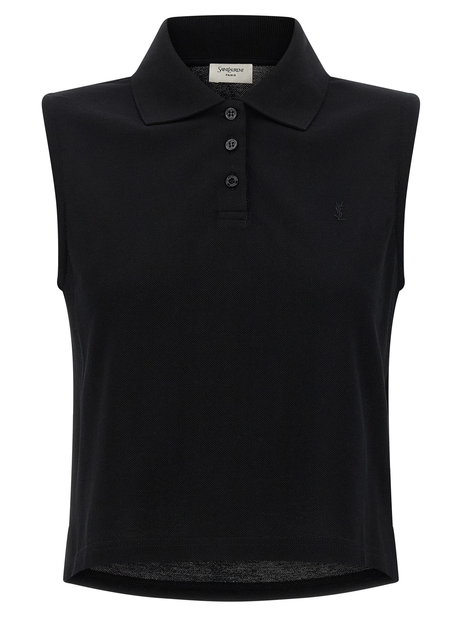 Polo shirt in piqué cotton with tone cassandre-on-tone embroidered logo on the front, Slightly cropped model, Collar and buttons, Sleeveless, Side slits, And asymmetrical hem.