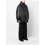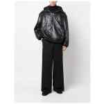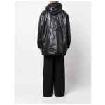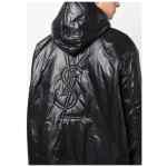 Cassandre Anorak oversized hooded coat from SAINT LAURENT featuring jet black, padded design, glossy finish, embroidered logo to the rear, slouchy drawstring hood, half front zip fastening, two side welt pockets, drop shoulder, long sleeves, elasticated cuffs and drawstring hem. Nylon blouson