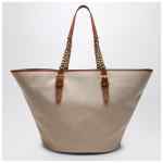 Desert-coloured canvas shoulder bag from Saint Laurent featuring beige leather trim, two top chain handles, an interior flat zipped pocket, a removable YSL logo tag and bronze-coloured metal hardware.