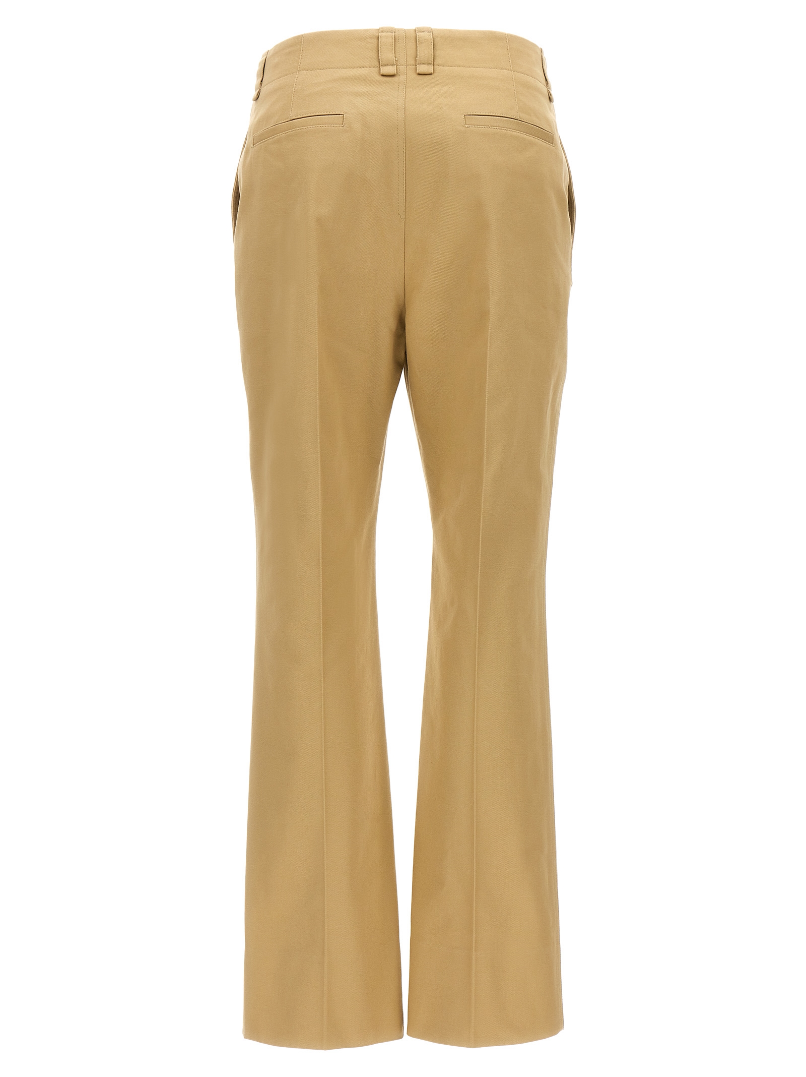 Cotton drill trousers, button closure, pockets, leg with stretched crease.