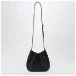 Saint Laurent black hammered leather shoulder bag, featuring an adjustable shoulder strap with buckle, drawstring closure, and bronze-colored metal Cassandre charm.