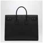 Large black hammered leather tote bag from Saint Laurent, featuring round handles with a removable leather lock, adjustable and removable shoulder strap, top opening, two internal compartments separated by a removable zip pouch, and bronze-colored metal parts.