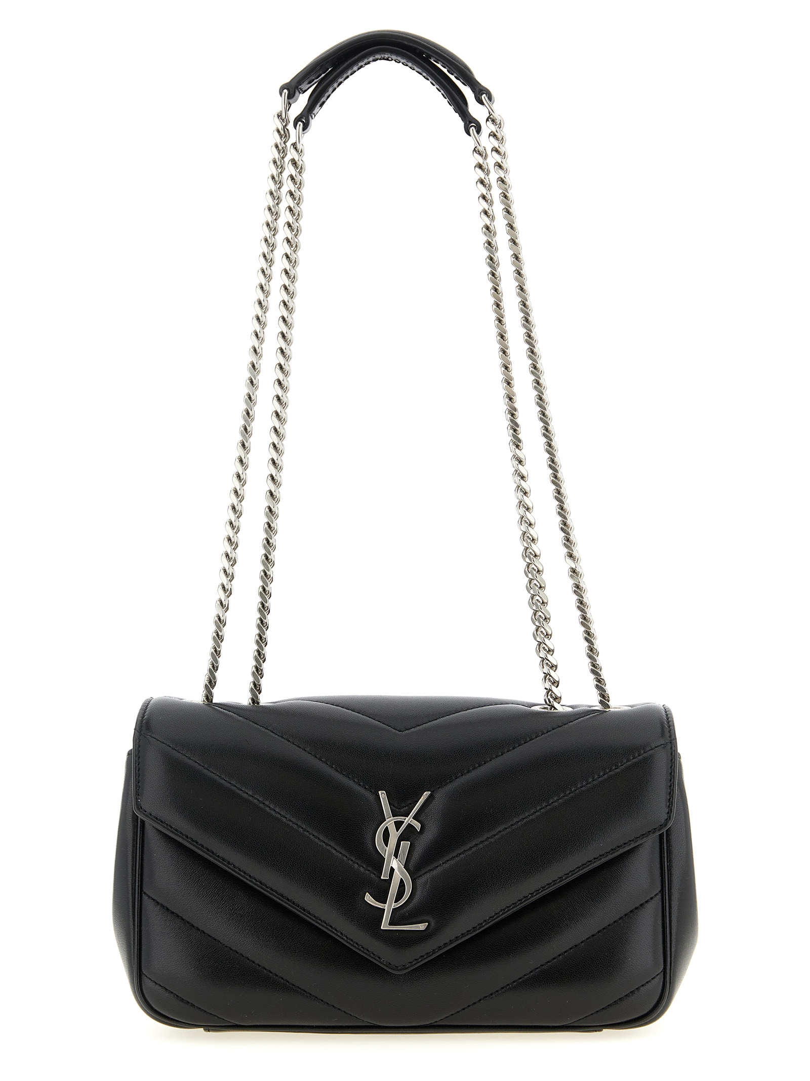 Small ‘loulou’ lambskin shoulder bag with chevron quilted stitching, Magnetic flap closure with antiqued metal cassandra logo on the front, Grosgrain lining, Sliding chain shoulder strap with leather protection, Removable clutch bag, Mirror.