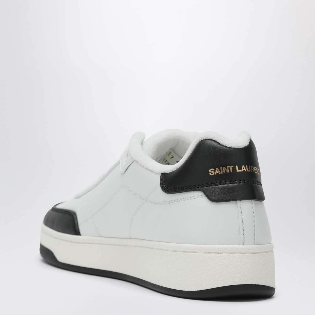 Black/white smooth leather sneakers by Saint Laurent featuring leather upper, round toe, lace-up fastening, logoed tongue, gold logo on side, black logoed padded heel and rubber sole.