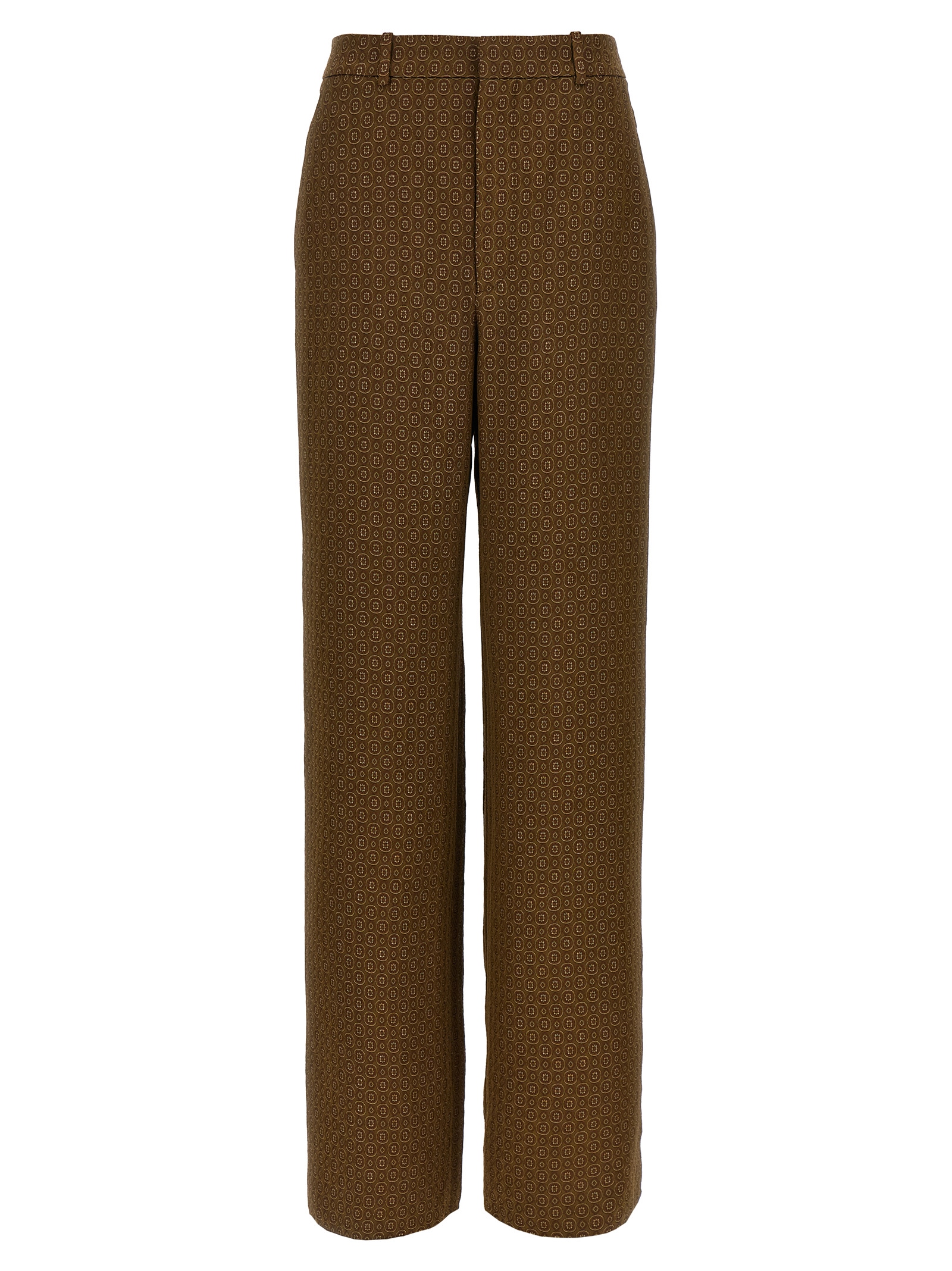 Viscose twill pants, jacquard ‘Medaglioni’ pattern, slightly loose fit, straight leg, front zip and hook closure, side pockets.