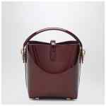 Mini bucket bag by Saint Laurent in burgundy patent leather, featuring front Cassandre hook closure, adjustable and removable shoulder strap, top handle, and bronze-tone metal hardware.