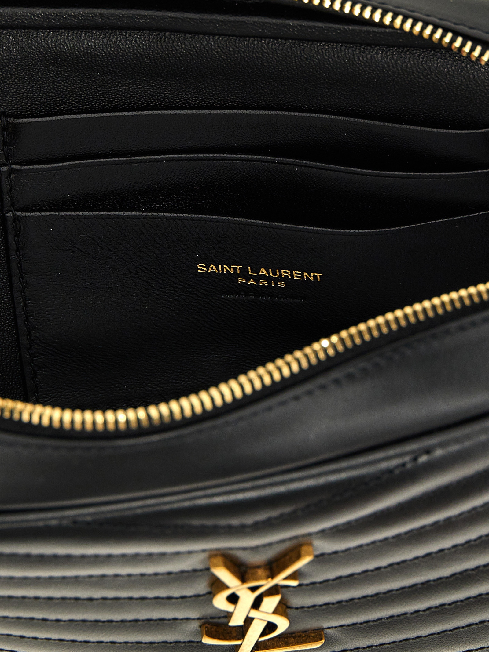 ‘Mini Lou’ calf leather crossbody bag with iconic chevron quilted stitching, antiqued metal Cassandre logo on the front, zip closure, back pocket, chain shoulder strap.