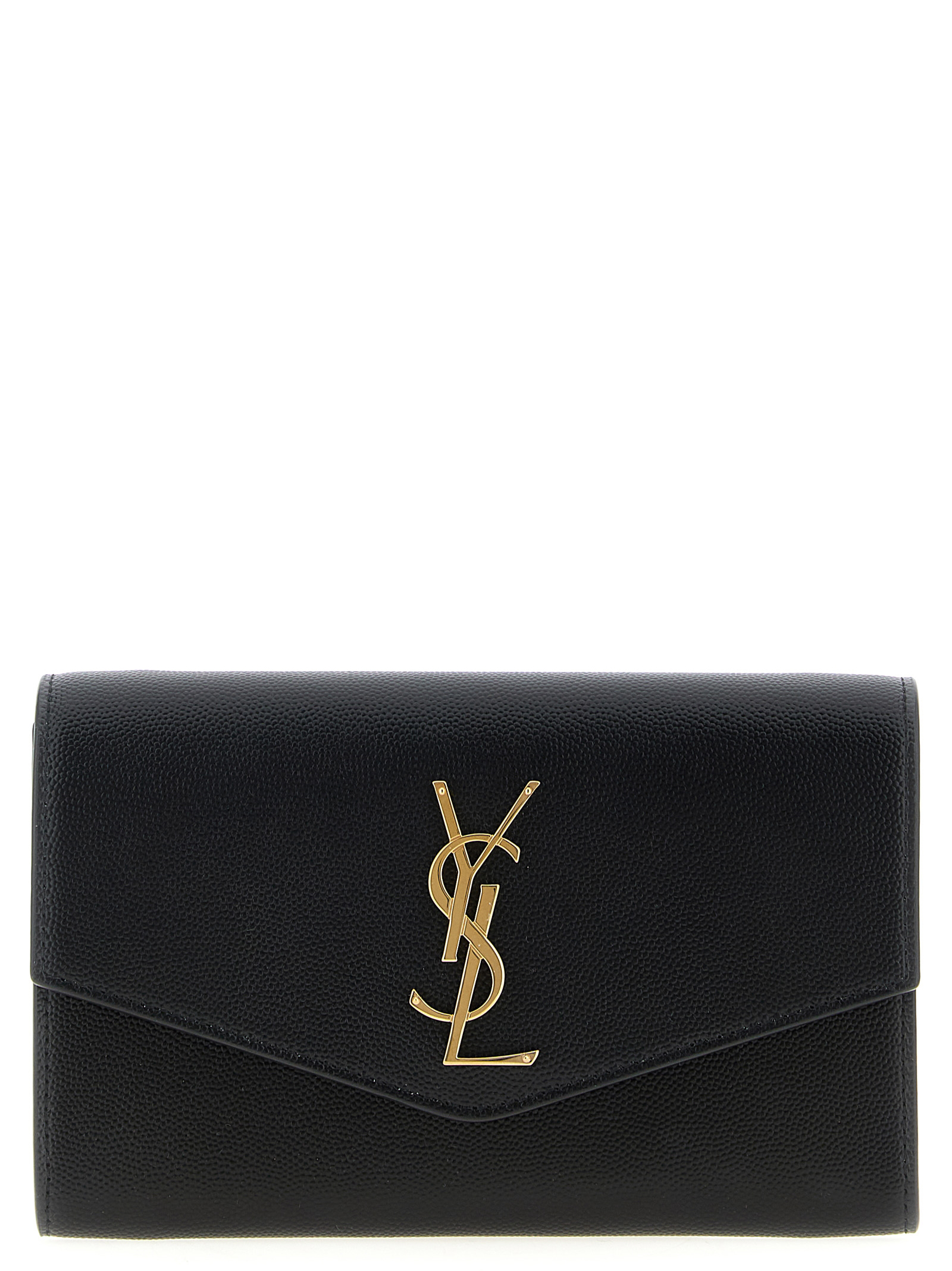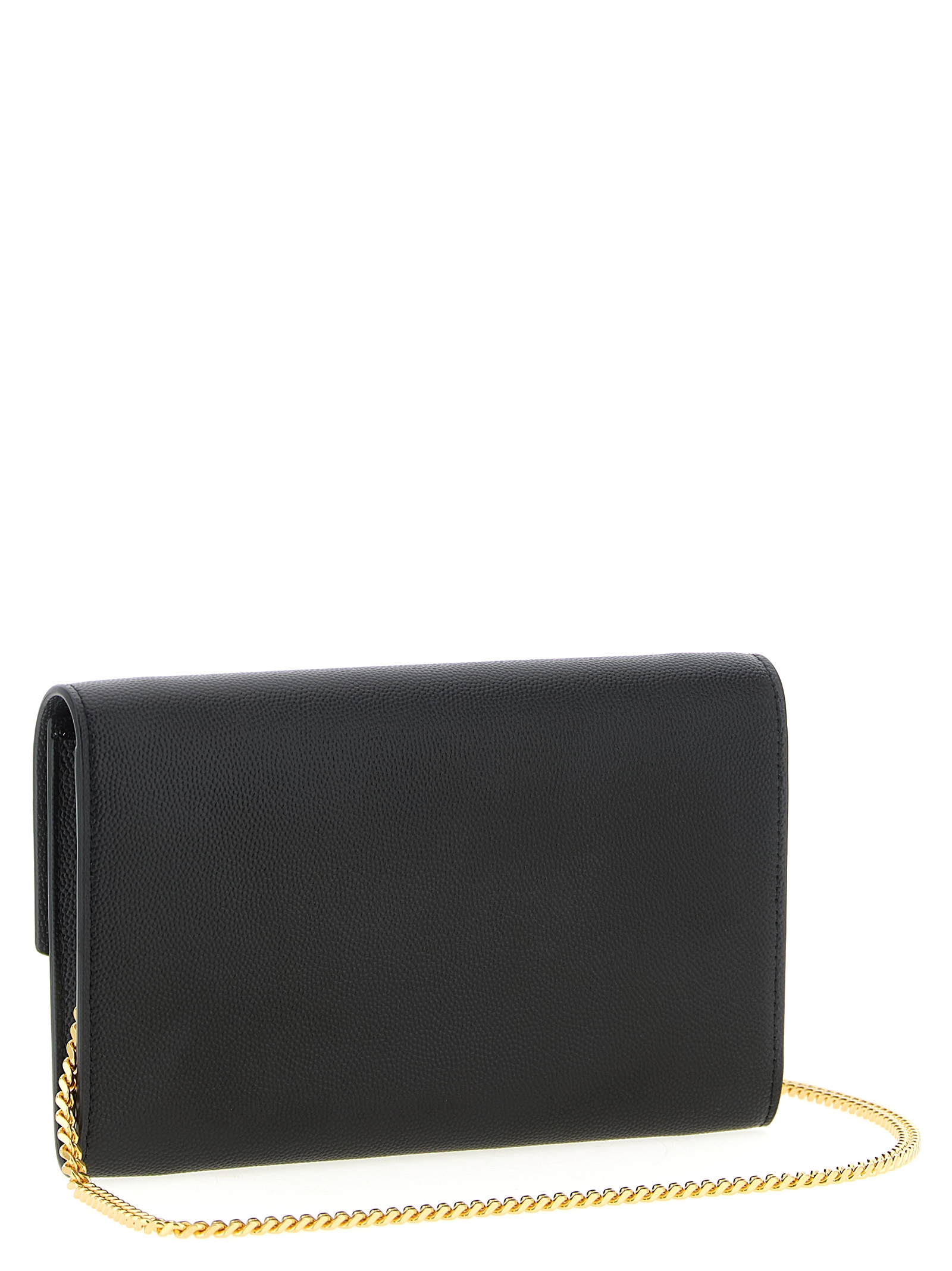 Grain de poudre royal leather clutch bag featuring a flap closure with the gold metal logo and gold removable chain.