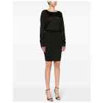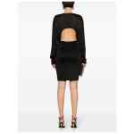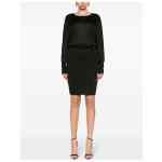 black knitted construction semi-sheer construction boat neck open back drop shoulder long wide sleeves elasticated waistband fitted waistline pencil silhouette straight mid-length hem Open-back knitted dress