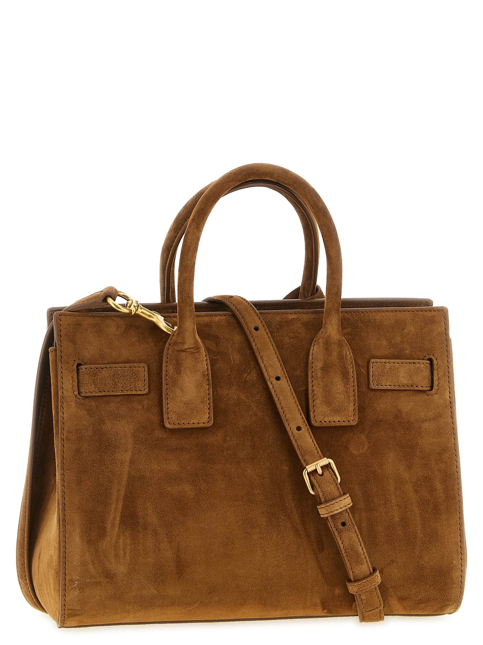 Small ‘sac de jour’ suede handbag with east-west design, Extendable side gussets with adjustable inner straps, Double fixed tubular handle, Rigid base with metal feet, Removable metal ‘cassandre’ padlock detail, Adjustable and removable leather shoulder strap, Adjustable and removable tape shoulder strap.