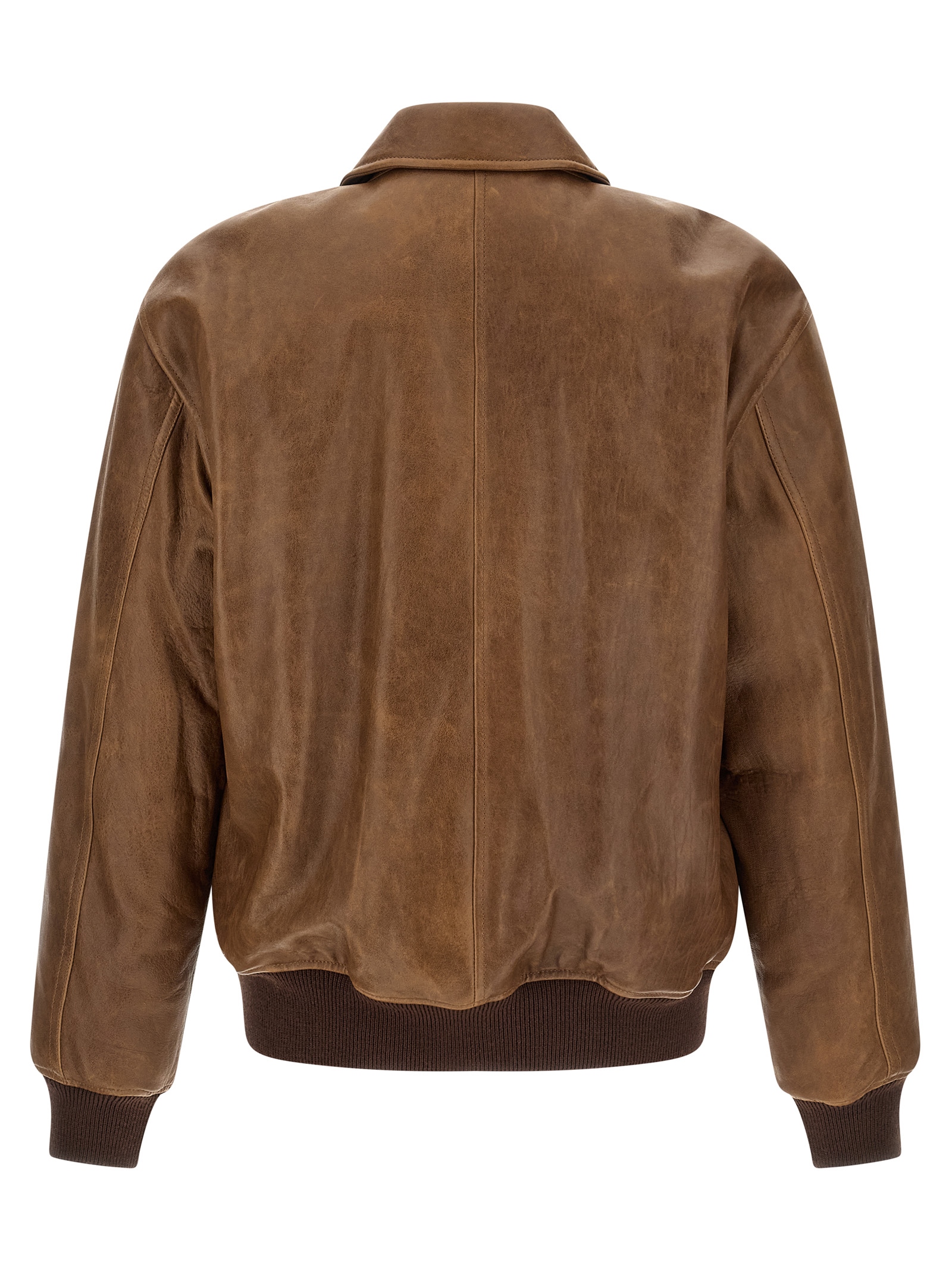 Vintage hammered lambskin bomber jacket with ribbed stretch wool knit details, Shirt collar, Zip and front snap button closure, Pockets, Long sleeves with cuffs and dropped shoulder, Headband, Viscose blend and padded cotton lining, And interior pocket.