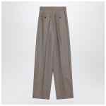 Wide trousers by Saint Laurent in taupe beige wool, characterized by a central crease, double pleats, high waist with belt loops, front closure with zip and hook, two side welt pockets and two back welt pockets with button.