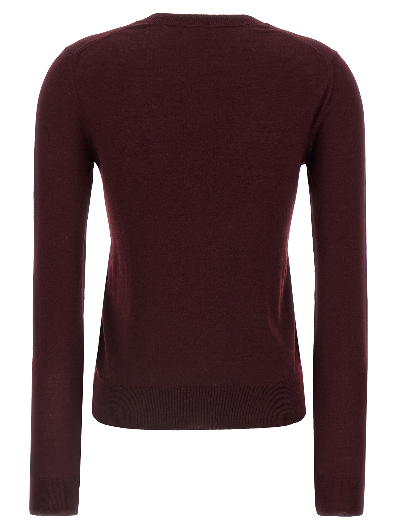 Virgin wool sweater with plunge V-neck, long cuffed sleeves.