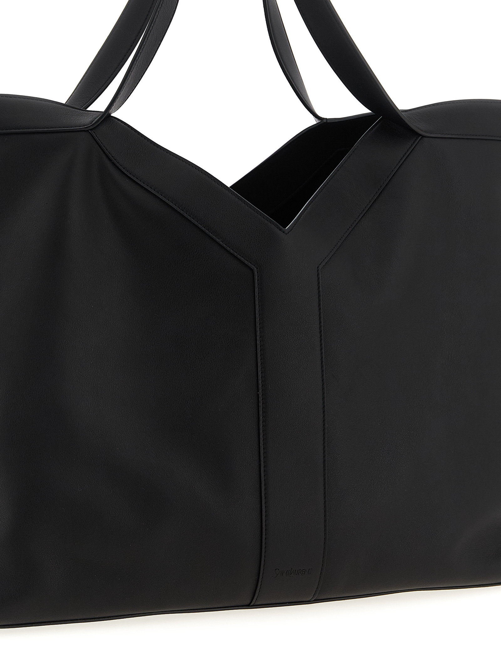 Large shopping bag in finely hammered leather, tone-on-tone suede lining, front and back insert to create a ‘Y’, double fixed handle, inner closure with snap hook.