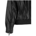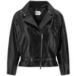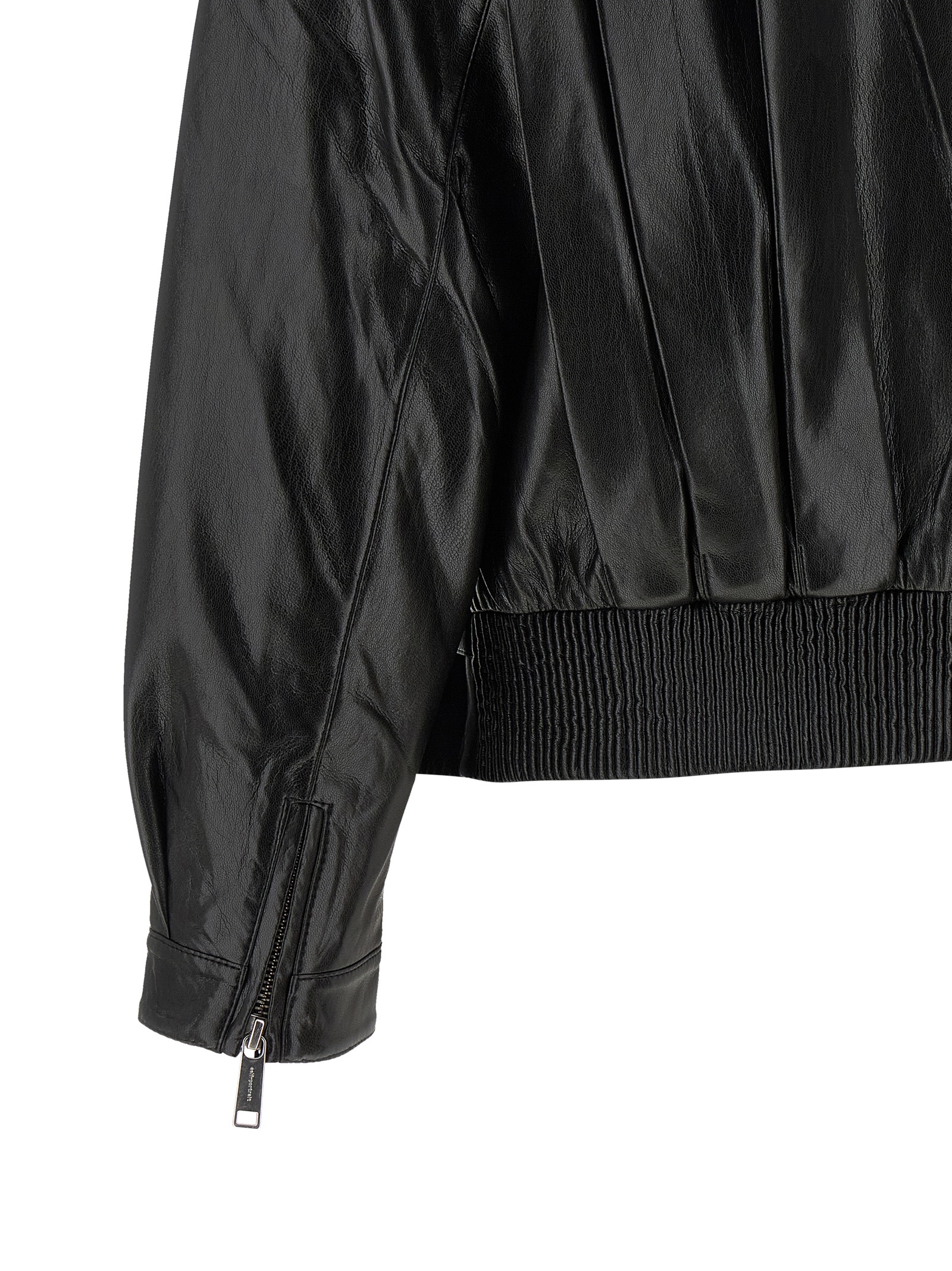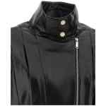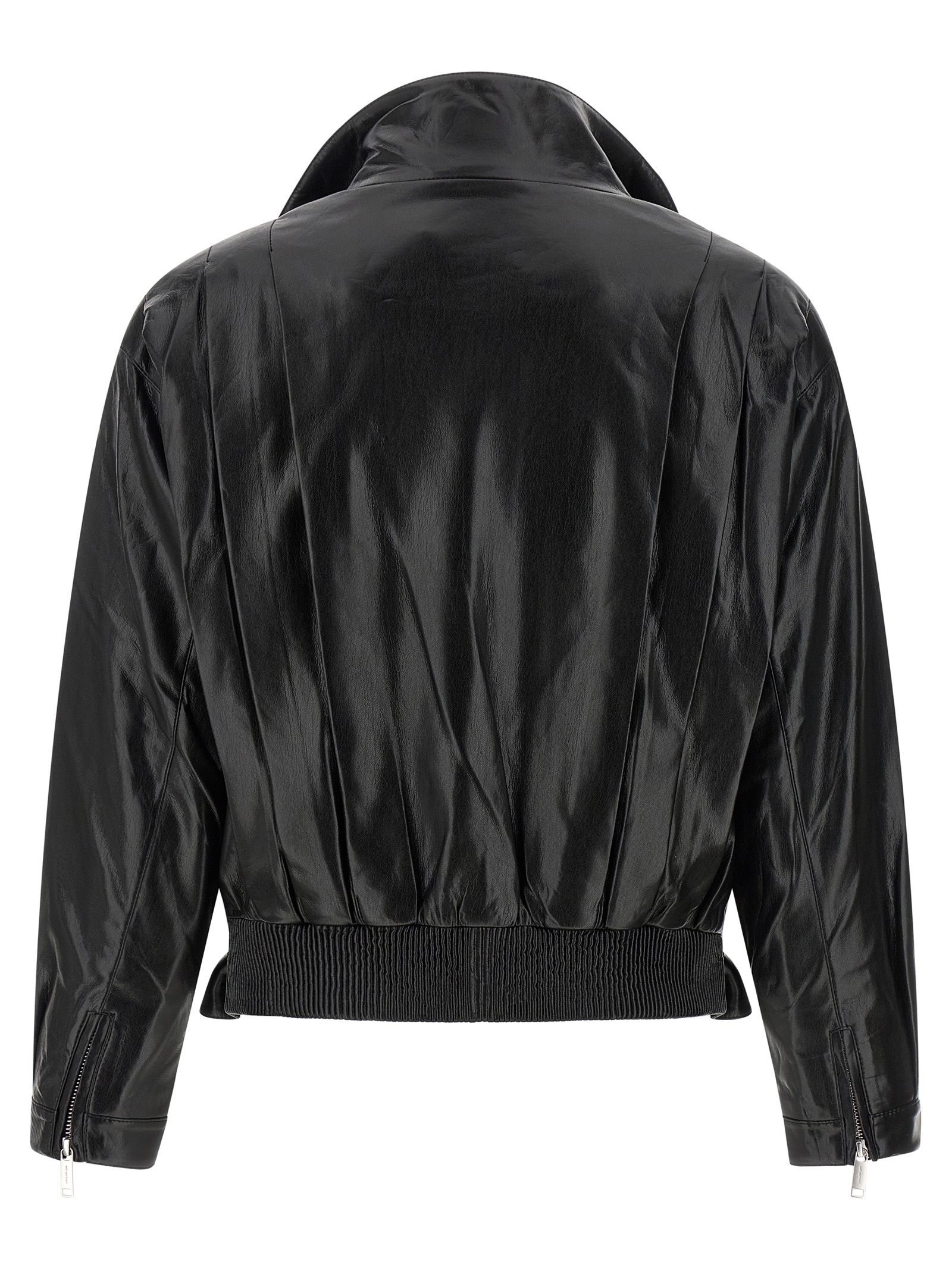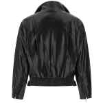 Biker jacket in shiny leather-effect fabric with pleats and pleats on the front and back, Fold-up standing collar, Asymmetric front zip closure, Pockets, Long cuffed sleeves, Zip on the cuffs and dropped shoulders, Back elastic band and adjustable front belt on the hem. Size and Fit – relaxed fit – UK sizing