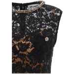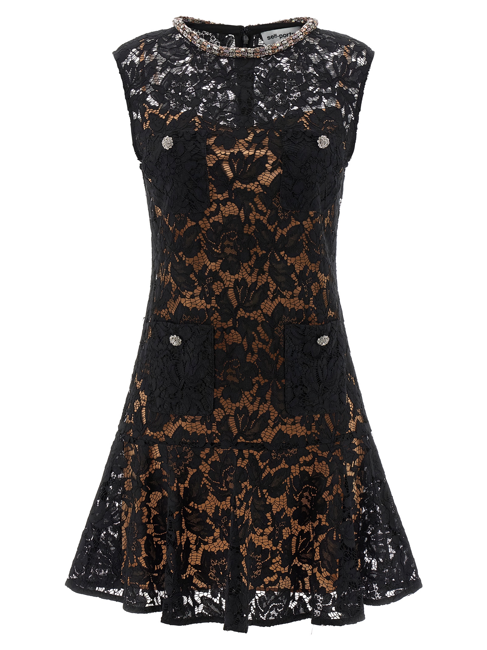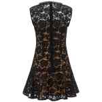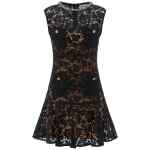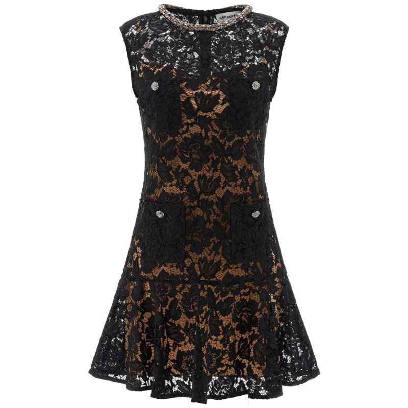 Mini ‘black lace crystal’ openwork lace dress with detachable petticoat, Crew neck with embroidered crystal detail, Sheath dress with ruffle curled on the hem, Front pocket detail with jewel buttons, Back closure with hidden zip, Sleeveless.