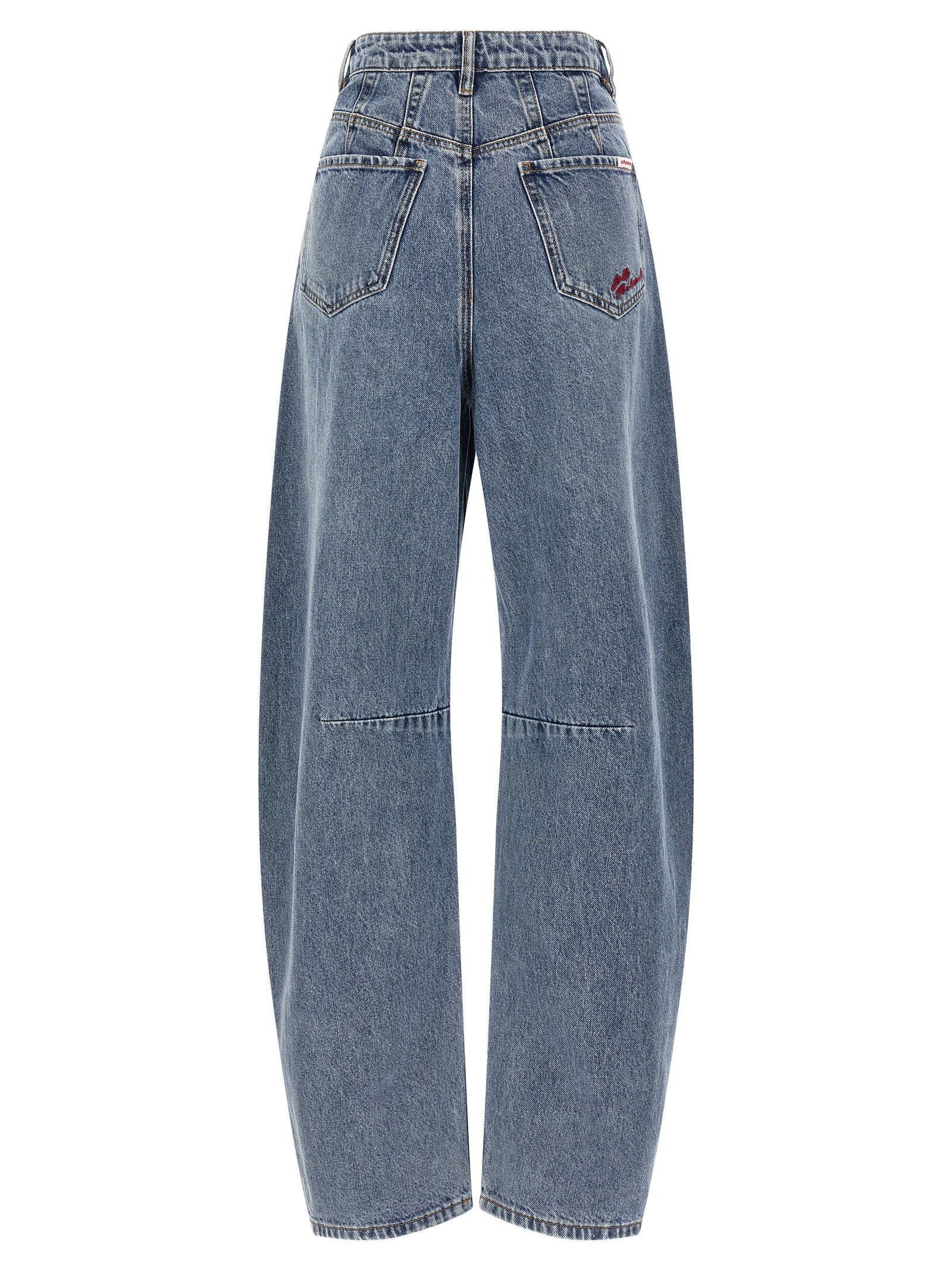 ‘blue barrel leg’ cotton denim jeans with front and back pin tucks, Contrast stitching, High waist, Cocoon silhouette, Five pockets, Front zip and button closure, And back logo embroidery.