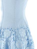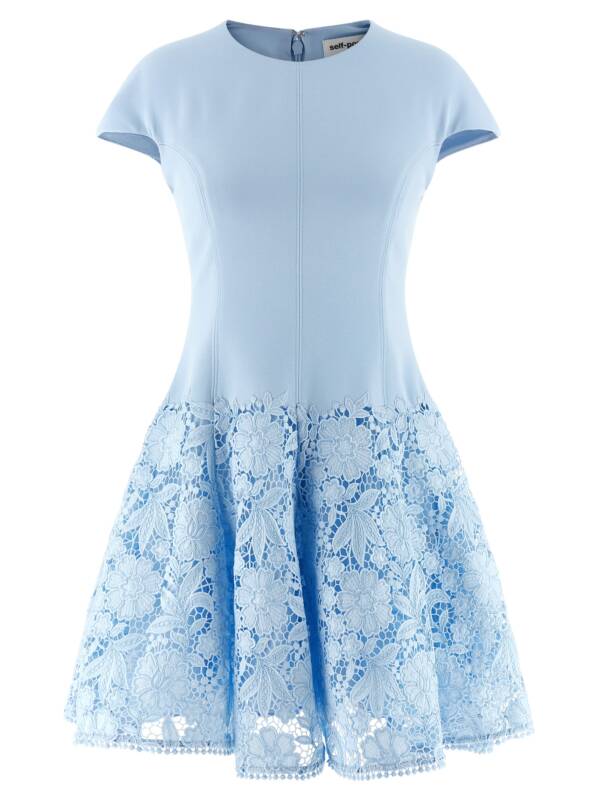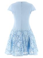 ‘blue crepe lace’ crepe de chine mini dress with perforated lace skirt insert with underskirt, Crew neck model, Back zip and hook closure, Short sleeves. Size and Fit – True to size fit