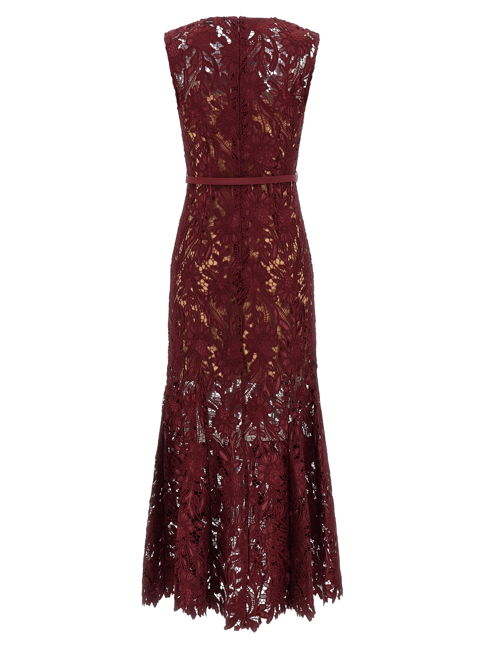 ‘burgundy guipure lace midi’ floral guipure lace dress, Flared skirt with asymmetric hem, Crew neck, Sleeveless, Back zip closure, Removable petticoat, Removable matching belt.