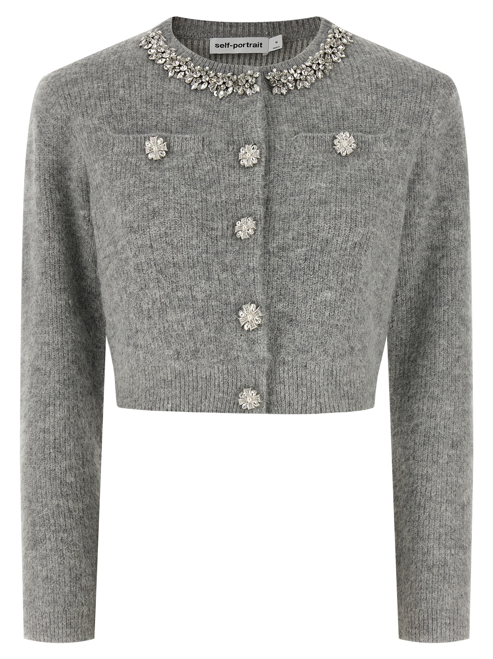 Self-Portrait Grey Fluffy Crystal Trim Cardigan