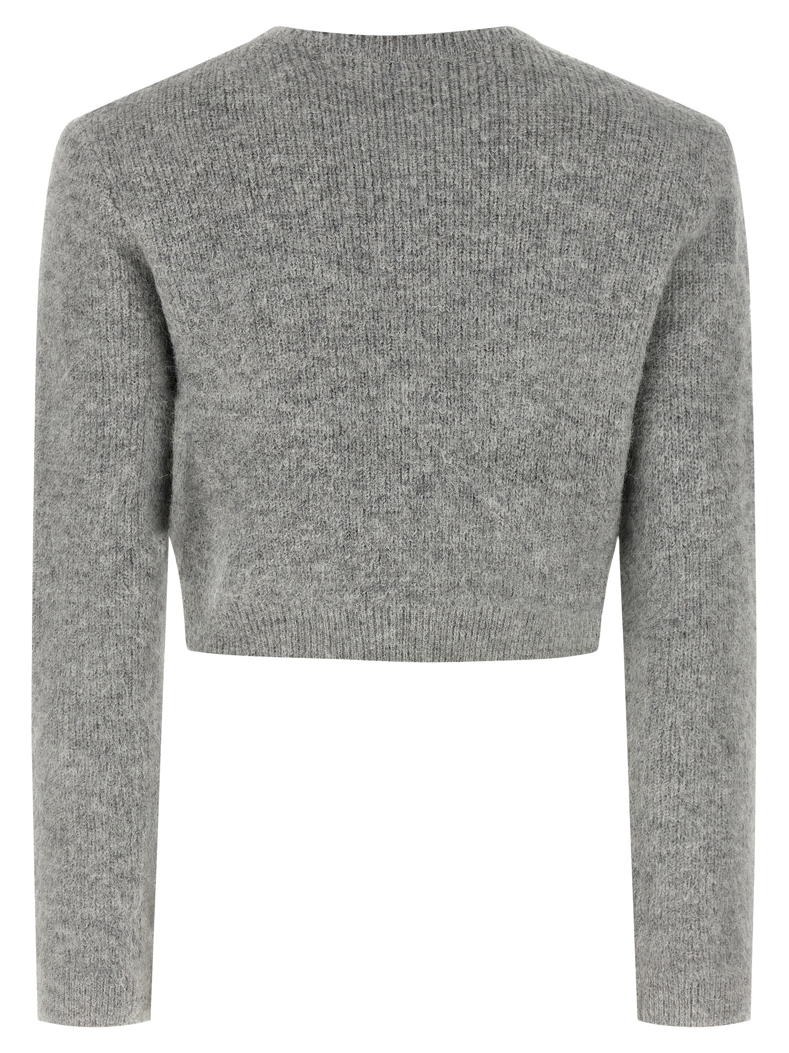 ‘grey fluffy crystal trim’ cardigan in alpaca and wool blend with fluffy effect lamé threads, Crew neck with crystal application, Front snap button closure with trompe l’oeil jewel button application, Pockets, Removable padded shoulder, Long cuffed sleeves. Size and Fit – true to size fit