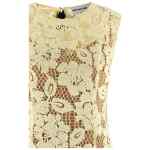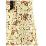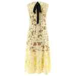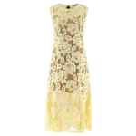 yellow crochet lace floral pattern round neck sleeveless flared silhouette scalloped hem Lace midi dress.