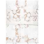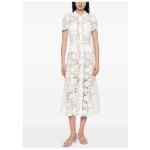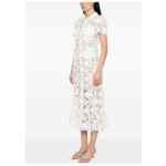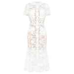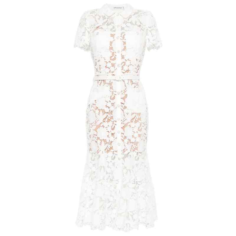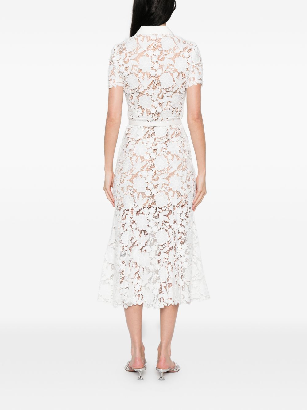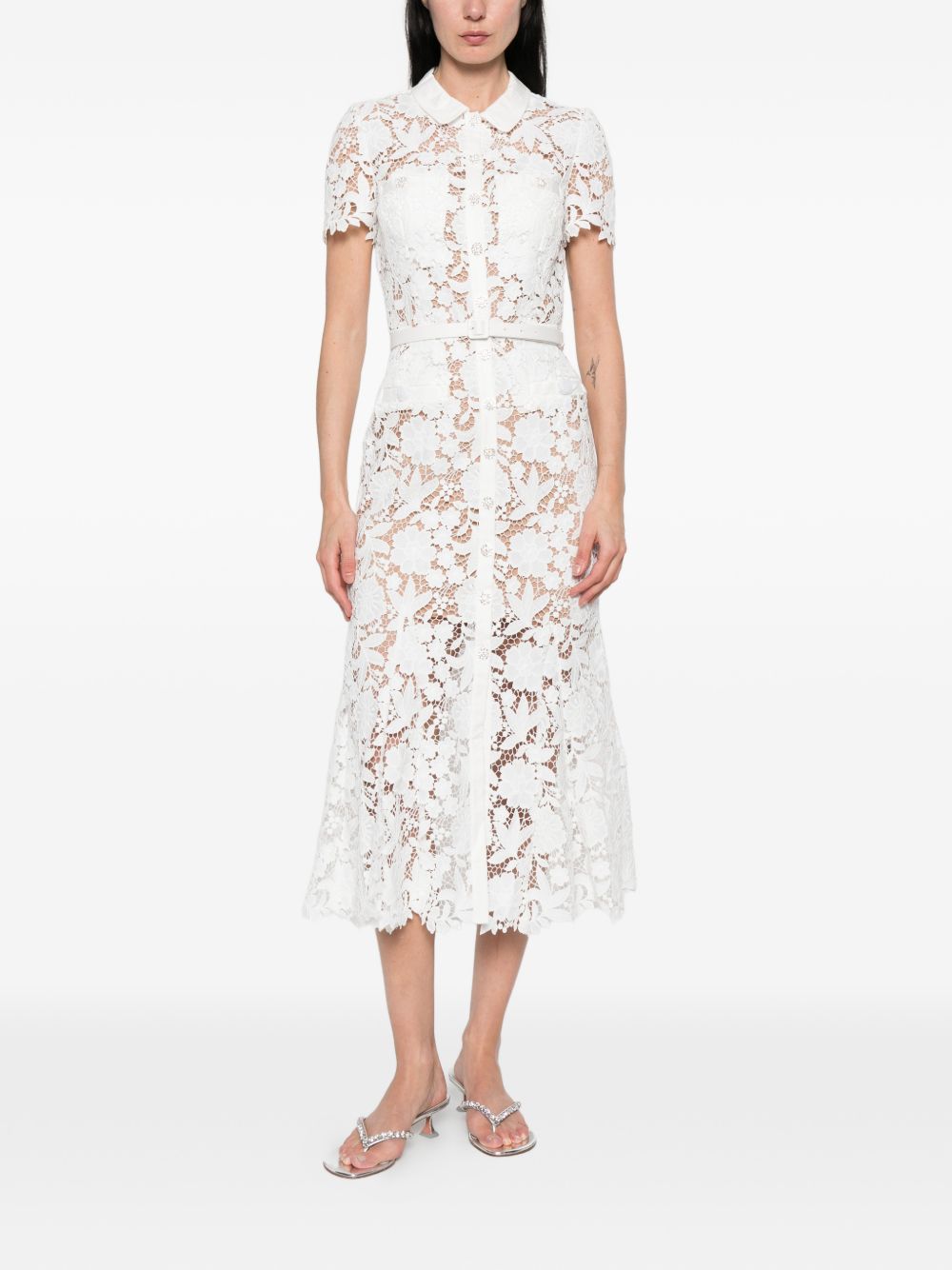 white, lace design, collared, short sleeves, belted waist, flared hem. Lace midi dress.