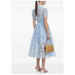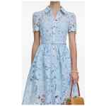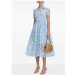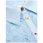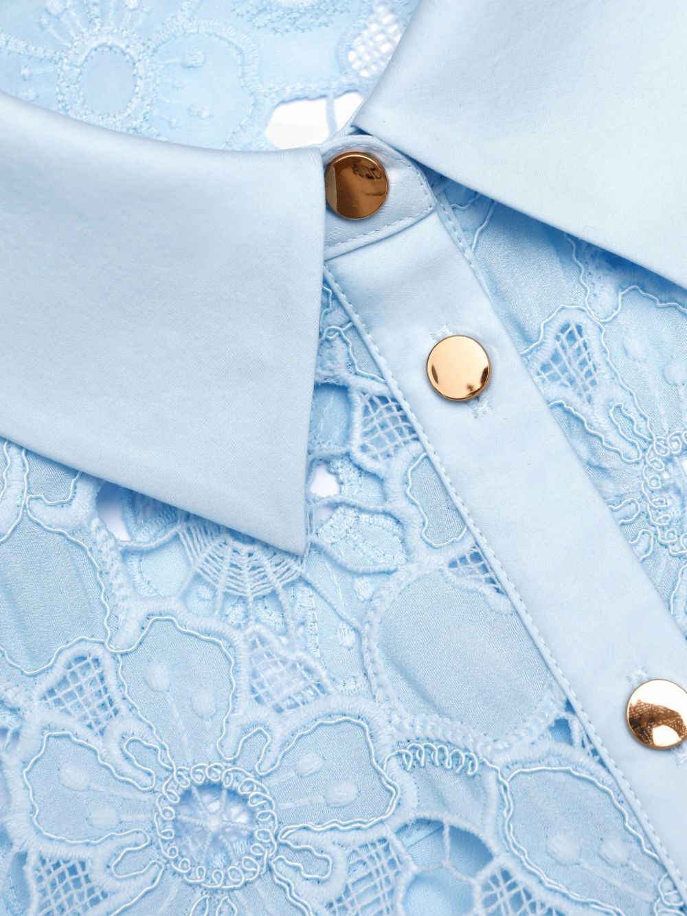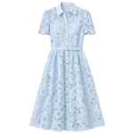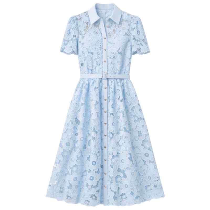 sky blue, lace, collared, button fastening, belt, short sleeves. Lace midi dress.
