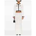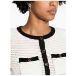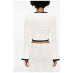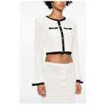 white/black pointelle knit contrasting ribbed trim round neck front button fastening long sleeves flared cuffs cropped straight hem unlined Crochet cropped cardigan