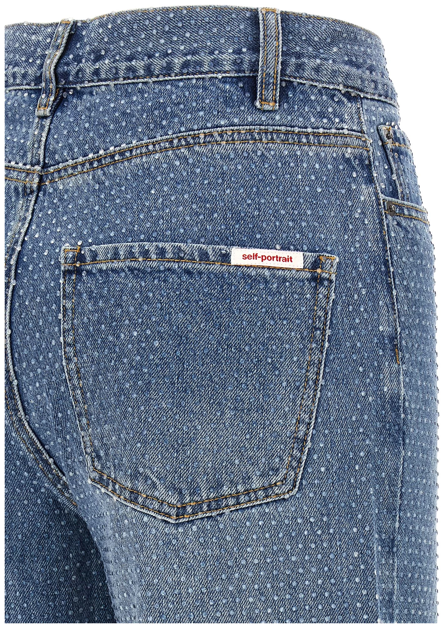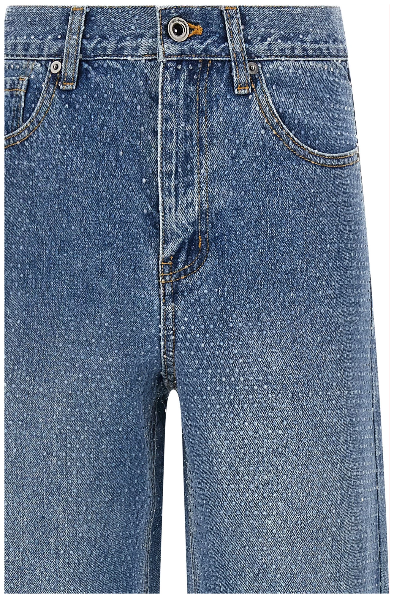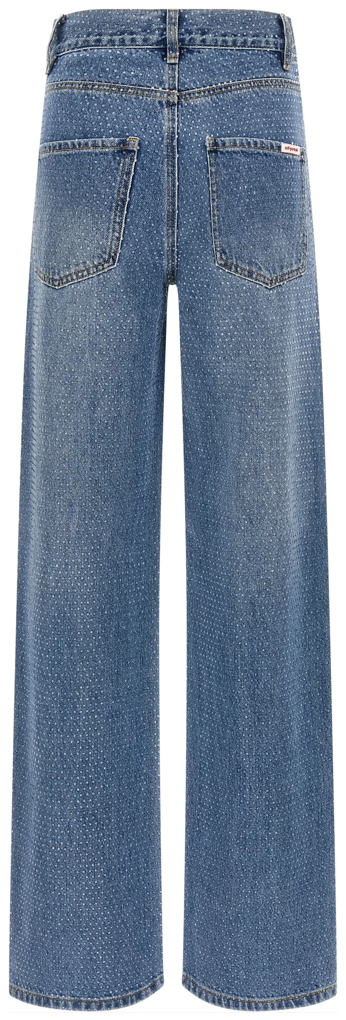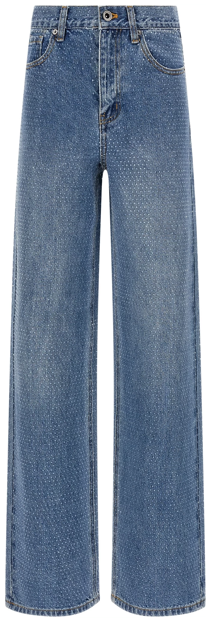 ‘rhinestone denim straight leg’ stonewashed cotton denim jeans with all-over crystal appliqué, Contrast stitching, Mid waist, Wide and straight leg, Front zip and button closure, Five pockets.