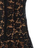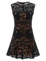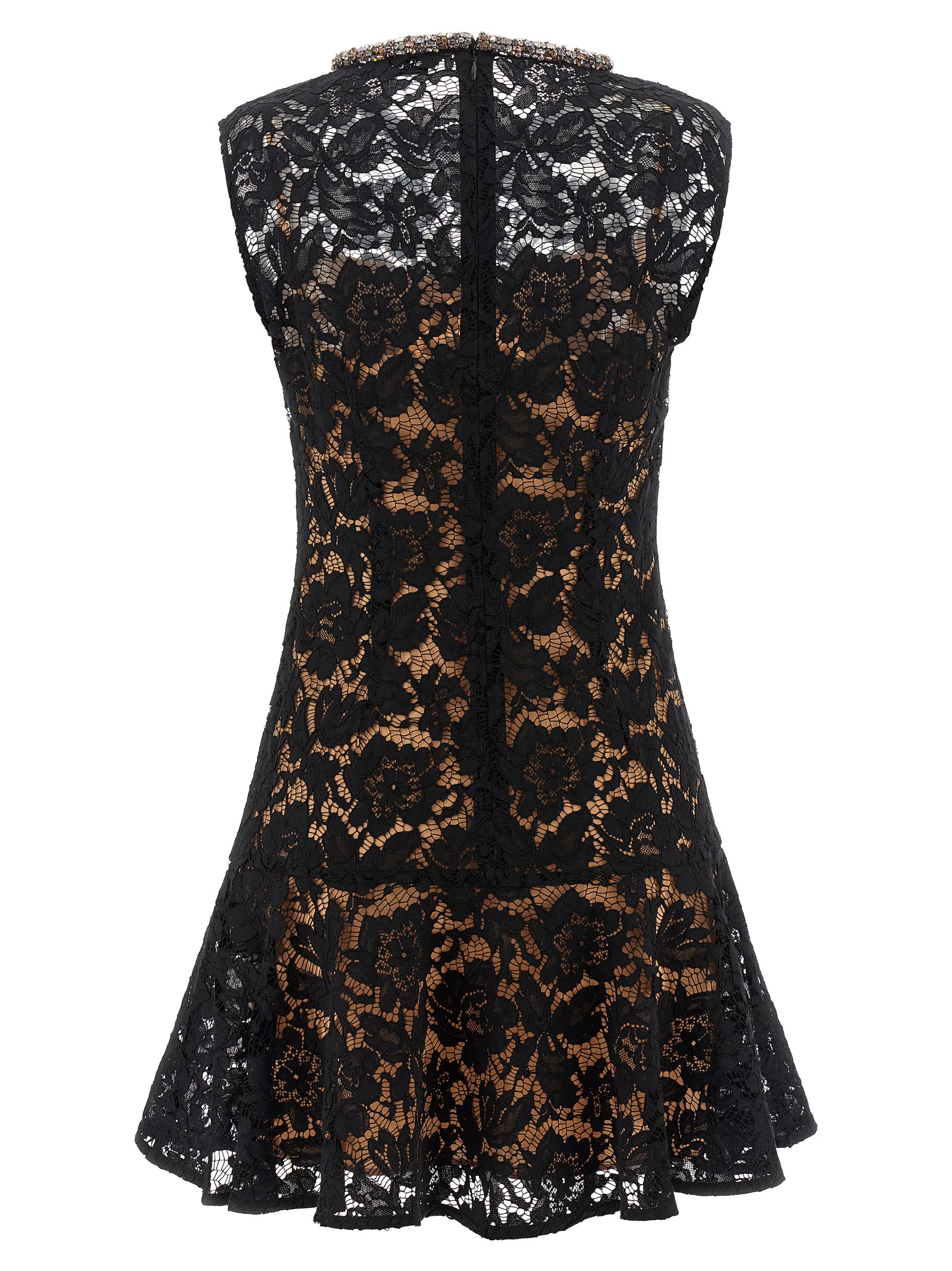 Mini ‘black lace crystal’ openwork lace dress with detachable petticoat, Crew neck with embroidered crystal detail, Sheath dress with ruffle curled on the hem, Front pocket detail with jewel buttons, Back closure with hidden zip, Sleeveless. Size and Fit – True to size fit