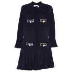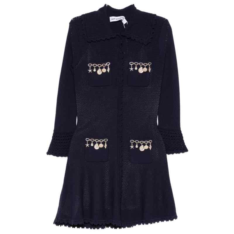 navy blue charm detail pointelle knit scalloped trim long sleeves Short dress.