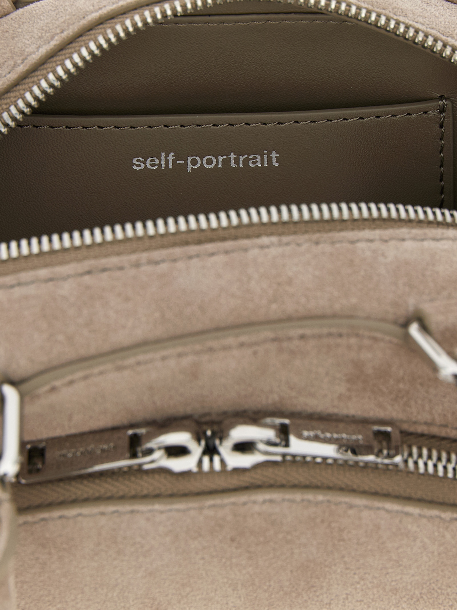 ‘Suede mini with charm’ shoulder bag, double handle, zip closure, front zip pocket, removable metal charm detail.