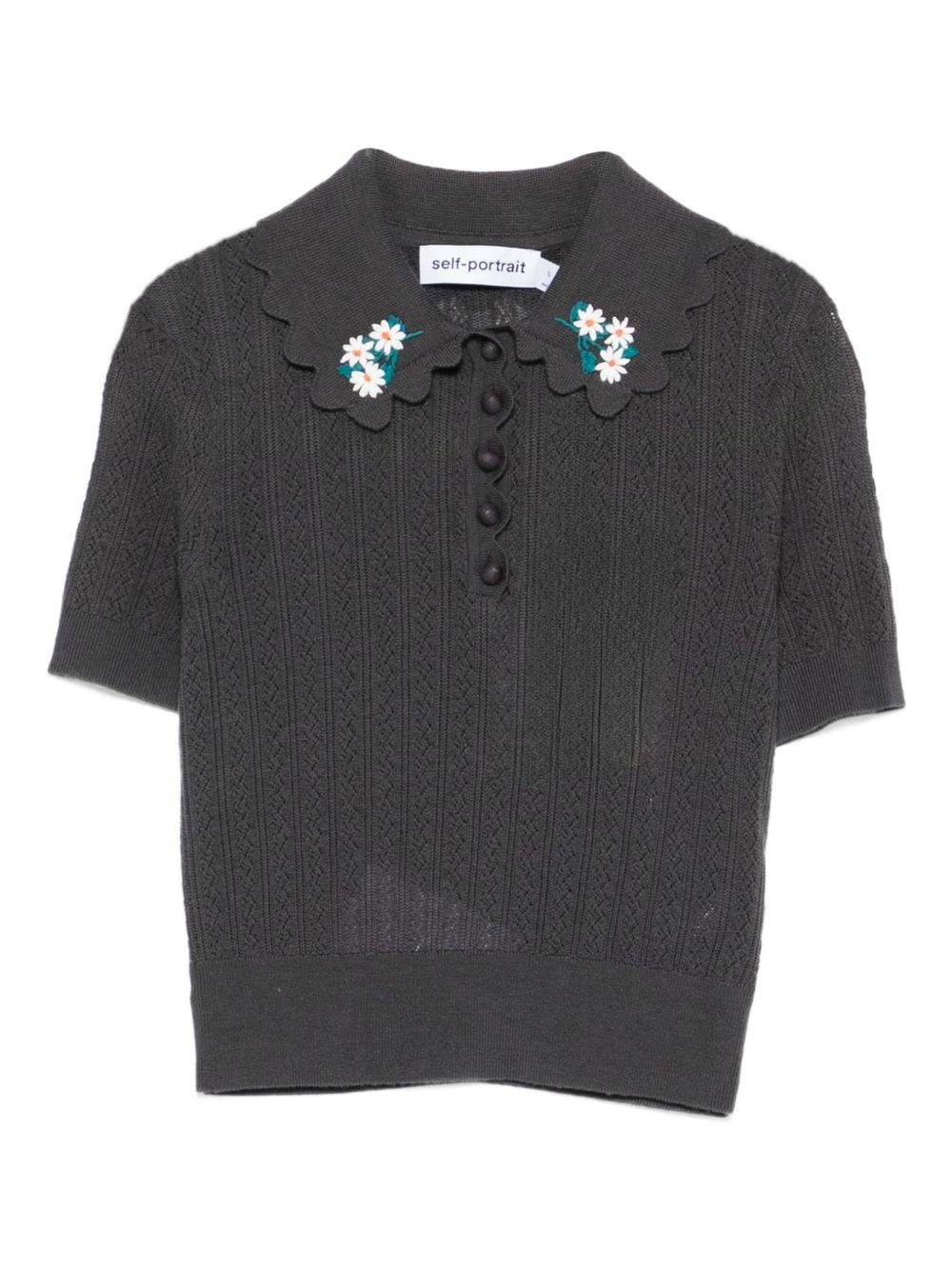 grey floral appliqué scalloped collar short sleeves front button fastening semi-sheer knit Wool embroidered polo shirt.