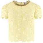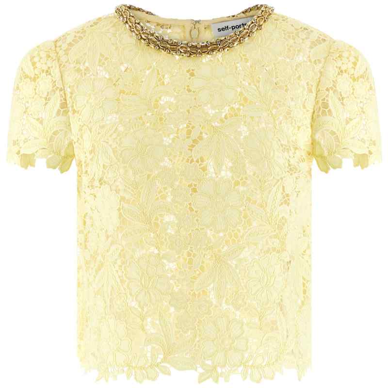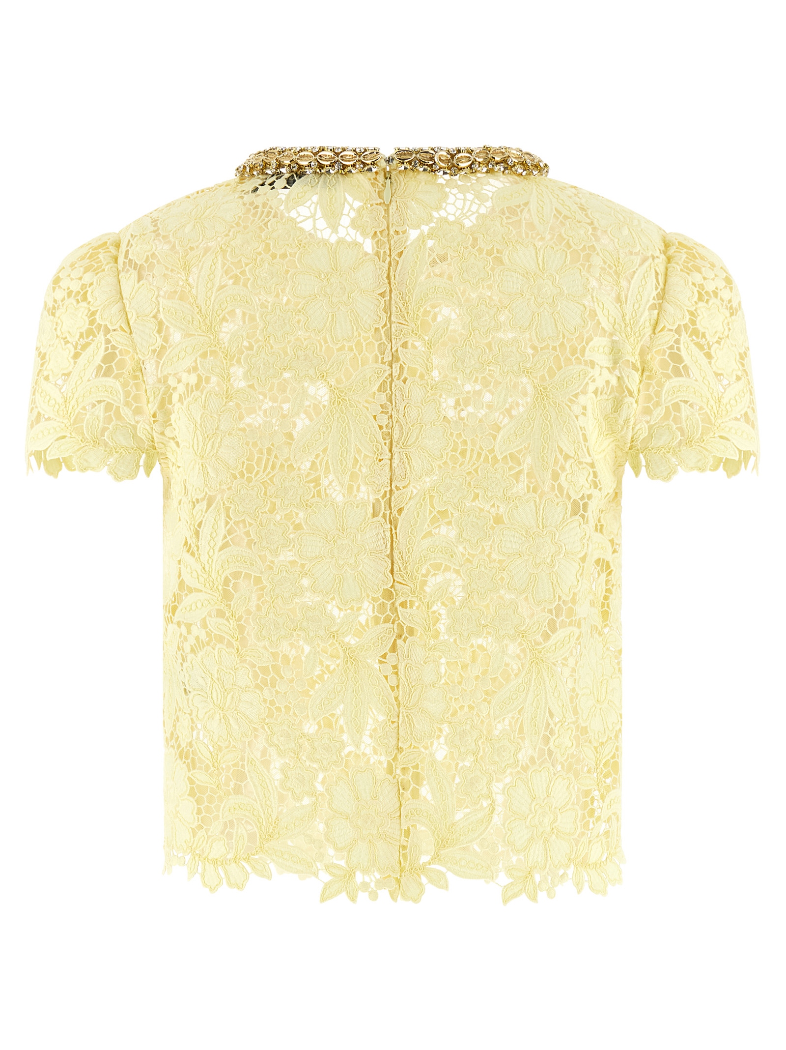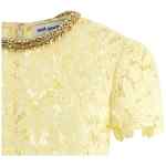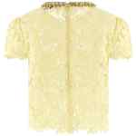 ‘pink lace’ lace top with i don’t see, Crew neck with pearl and crystal detail, Short sleeves with puff shoulder strap, Back button closure with cut-out teardrop detail.