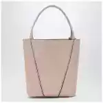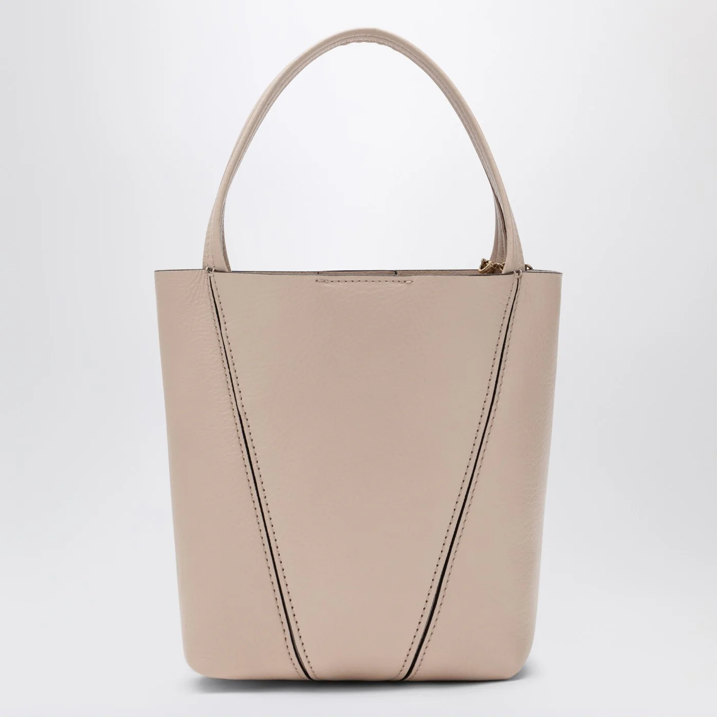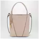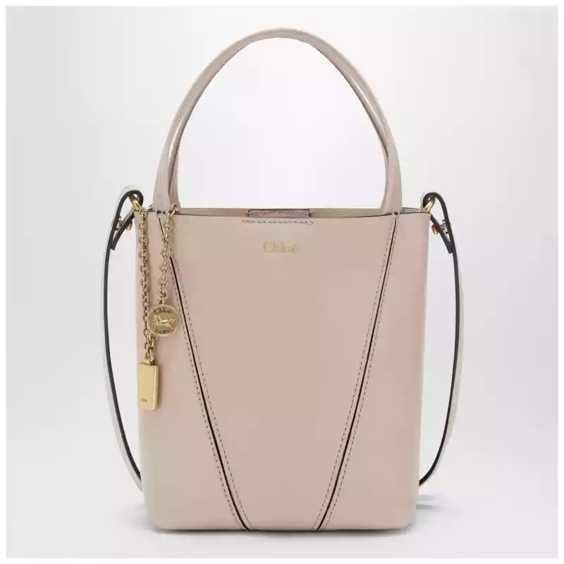 Small tote bag by Chlo in Cement Pink grained leather two leather handles with gold finish metal ring magnetic closure adjustable and removable shoulder strap chain charm front logo print. Size and Fit – Width 18 cm x Height 19 cm x Depth 8 cm Adjustable shoulder strap length min 120 cm – max 130 cm Handle drop: 13 cm