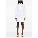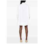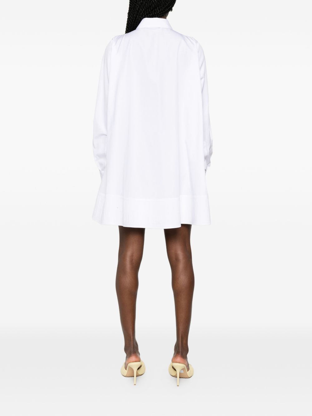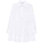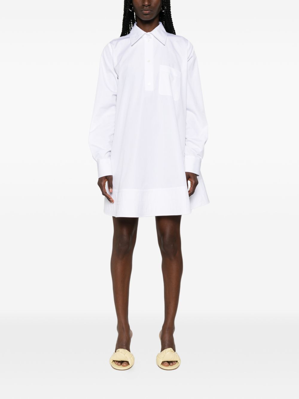 white cotton classic collar partial button fastening chest patch pocket long sleeves buttoned cuffs A-line silhouette Cotton mini shirtdress.