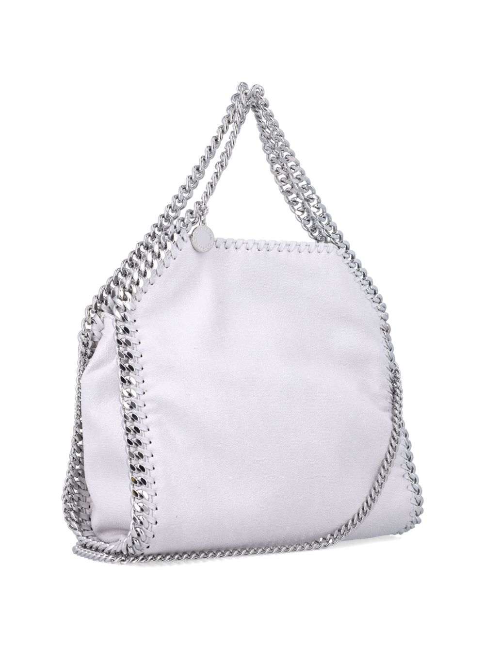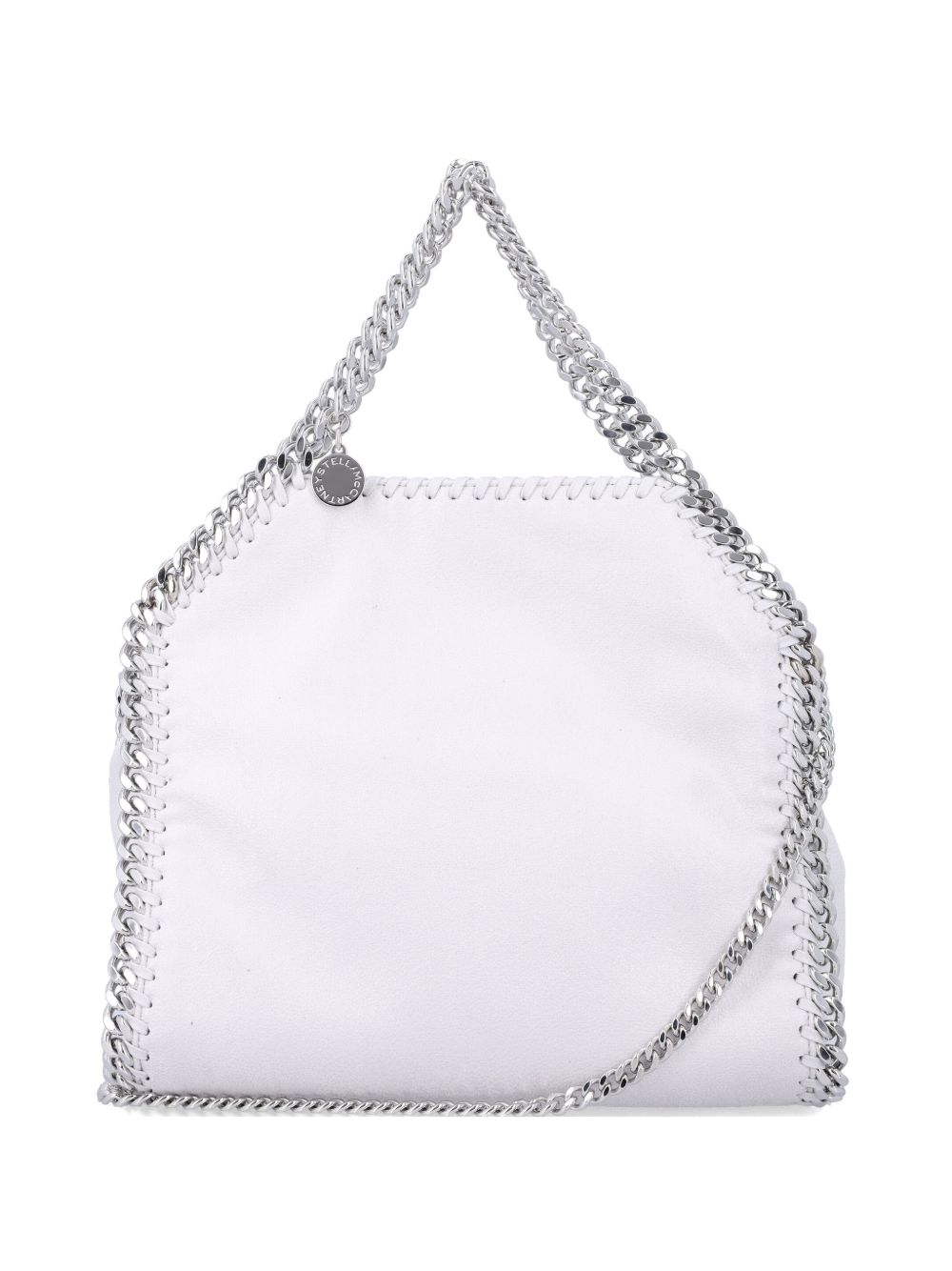 white chain detailing top handles logo charm chain shoulder strap Falabella mini tote