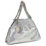 silver chain detail logo medallion magnetic safety clasp Falabella mini drastring tote