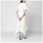 Dress by Stella McCartney in butter-colored glossy viscose-blend satin, featuring V-neckline, short flutter sleeves, back zip closure, and asymmetric hem.